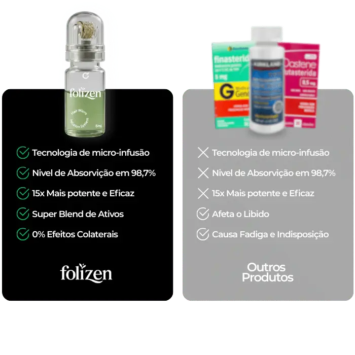 O Super blend de ativos naturais do Folizen bloqueia a ação do DHT diretamente na raiz, interrompendo o processo de queda e afinamento desde a primeira aplicação